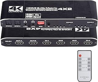 HDMI マトリックス スイッチャー スプリッター 4入力 2出力 + 音声 分離 (SPDIF 光デジタル+3.5mmステレオミ+IRリモコン) 4K HDR, 3D, HDMI 2.0b, HDCP 2.2 HDMI Matrix 4X2 切替 分配器 HDMI 音声分離器 PS3, PS4 pro, Xbox, 任天堂 スイッチ, HD player, Fire TV, Apple TVなど対応